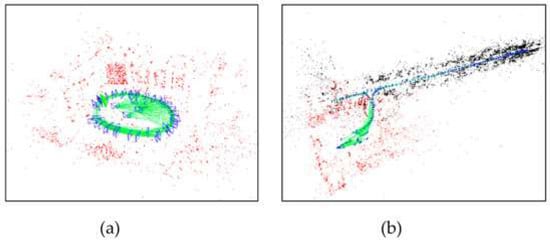 Figure 4a [] shows the mapping of a room with the camera’s estimated position along its trajectory. Figure 4b [] illustrates the mapping along a hallway. Key features of SLAM include localization, mapping, sensor fusion, filtering, and optimization. Regarding filtering and optimization, SLAM employs techniques such as an Extended Kalman Filter (EKF) and graph optimization. An EKF is a state estimation technique that enables the robot’s position and orientation to be updated in real time, while graph optimization is an approach that improves the consistency and accuracy of the map and position estimates over time []. These capabilities enable SLAM to facilitate autonomous navigation in unknown environments, providing robustness against uncertainties, sensor data errors, and motion models. However, this technique presents challenges in terms of computational complexity, convergence, and the consistency of filtering and optimization algorithms.
