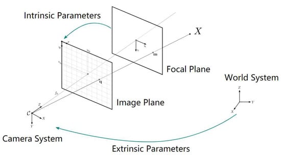 In Figure 5 [], the pinhole camera model (also known as the pinhole camera) is shown. It is a simplified model that illustrates how a camera captures images of the real world by projecting points from a three-dimensional space onto a two-dimensional plane (the image plane).