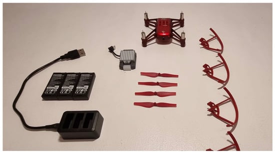 The drone used to perform the experiments is a Tello Romaster TT, a small quadcopter drone developed by DJI for educational purposes (see Figure 7). It is open-source and offers software scalability through its software development kit and hardware scalability through its sensor adapter with I2C, SPI, UART, and GPIO interfaces. The main components of the drone are a 5 MP HD camera that allows it to capture still images and videos, some different sensors, such as time of flight, a barometer, and an inertial measurement unit or IMU. It also has brushless motors, and a lithium-ion battery allowing it to fly for up to 10 min on a single charge.