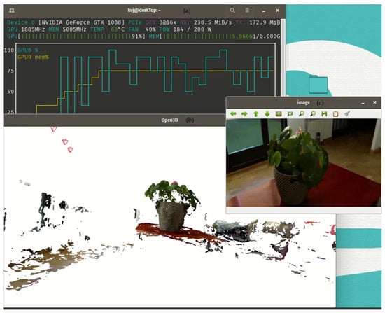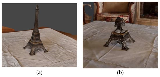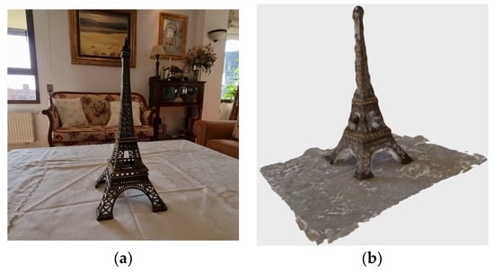 Regarding hardware resources, both methods require 8 GB of RAM. However, Meshroom requires an NVIDIA CUDA-enabled GPU with a capacity greater than or equal to 2.0 and 8 GB of RAM [], while the proposed system demands an NVIDIA CUDA-enabled GPU with a capacity greater than or equal to 3.0 and 16 GB of RAM. Although the proposed system requires higher hardware resources, these are compensated for by the notable reduction in processing time compared to Meshroom.