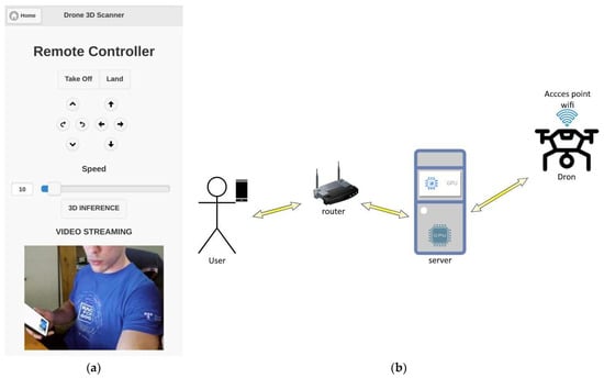 For the implementation of the proof of concept, the following tools and algorithms, which are described in Section 1, were used: OpenCV, CDSFNet, DROID-SLAM, Meshroom, and Open3D. In addition, the Poisson Surface Reconstruction (PSR) algorithm was used for the export of 3D meshes, the Flask framework for creating a web interface to control the drone, and FFmpeg [,] for decoding the video signal emitted by the drone.