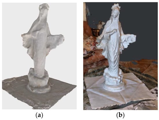 Three-dimensional mesh reconstruction of the figure, Virgin of Medjugorje. (a) Results obtained through the proposed system. (b) Results obtained through Meshroom software.