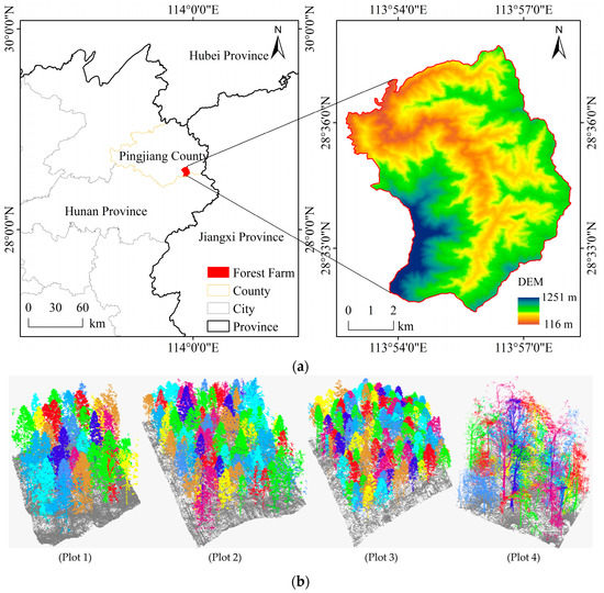 (a) The study area and its location in Hunan Province of China; and (b) the diagrams of the complexity degree of stand structures and conditions for (plot 1)—simple stand; (plot 2) and (plot 3)—less complex stands; and (plot 4)—complex stand (within each of the plots, each color indicates an individual tree).