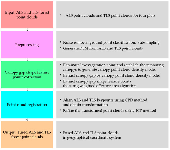 The flow chart of the proposed method to register the ALS and TLS point clouds in the forested area.
