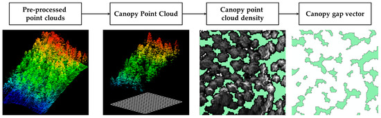 Canopy gaps are empty areas or polygons in forest canopy layers caused by the natural aging of trees, natural disasters, and man-made logging [42,43], which can be expressed as the areas under the vertical projection of the gaps between tree canopies. At present, LiDAR data canopy gap identification methods are mainly based on canopy height models (CHM) and point clouds, respectively. Canopy gap identification based on the CHM includes the threshold method, the pixel-by-pixel method, and the object-oriented method [43,44,45]. Point cloud-based canopy gap recognition includes the voxel method [46] and clustering [47]. In this study, canopy gaps were extracted directly from the perspective of the forest canopy, and the workflow consists of three steps (Figure 3): (1) canopy point cloud separation and canopy point cloud density model generation; (2) binary image conversion and canopy gap boundary vector generation; and (3) canopy gap size screening.