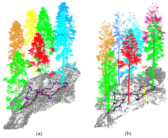 The TLS and fused point cloud data were normalized before individual tree segmentation to remove the effect of terrain. In this study, we used the comparative shortest path algorithm based on ecological theory to separate individual tree point clouds and extract individual tree parameters [49]. In this method, identifying tree trunks is first carried out; that is, each tree trunk is identified by fitting the point clouds at DBH height by the Density-Based Spatial Clustering of Applications with Noise (DBSCAN) algorithm or circular detection method [50]. Trees tend to use the shortest path to optimize resource allocation in the process of water and nutrient transmission. Therefore, the shortest path distance of each point of a tree is normalized according to the size of the DBH, and the shortest path after normalization is compared to determine the point of the tree that is closer to its root. The algorithm has been integrated into the LiDAR360 software. The DBH and tree height of both the registered point clouds and TLS point clouds were extracted automatically by the LiDAR360 software.