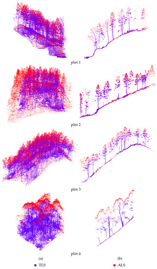 A quantitative evaluation of the registration accuracy of the proposed method is performed using the evaluation criteria described in Section 2.5.1. Figure 6a shows the global registration results for four plots. ALS and TLS ground points are fully overlapping, and there is no stratification in Figure 6b. The experimental results demonstrate that the proposed registration method can perform the registration of ALS and TLS point clouds successfully.
