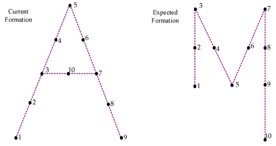 The current formation of 13 UAVs is set as the letter “N”, the desired formation is set as the letter “A”, and the compactness factor of the formation is set as ktight. The larger the ktight is, the thinner the formation is. For this simulation, ktight = 10; the specific coordinates of formation “N” and formation “A” are presented in Table 1.