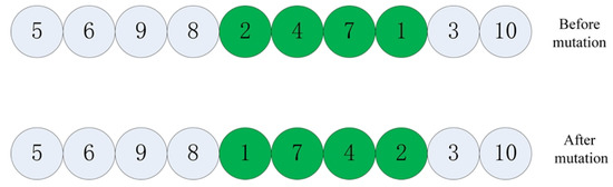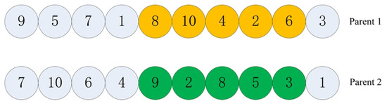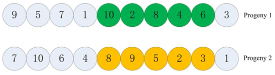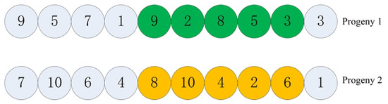 The operator crossover generation strategy is specific to the following steps: Firstly, we save the numbers in the sequence for each genetic operator using a hash table. Then, we perform a two-point crossover for the genetic operator. Next, we traverse the number sequence for the other genetic operator, removing numbers from the corresponding hash table if present and marking the corresponding number in the genetic operator as visited. Finally, we traverse the exchanged fragment of the genetic operator and sequentially remove and replace the data in the hash table of the genetic operator with the data removed from the unvisited position in the hash table. The resulting modified operator is shown in Figure 4.