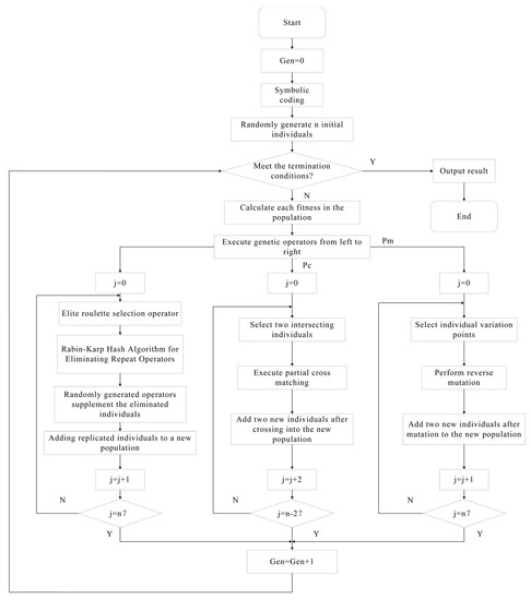 where fmax is the maximum fitness value in the population; favg is the average fitness value of the population per generation; f′ is the larger fitness value of the two individuals to be crossed; f is the fitness value of the individual to be mutated; and Pc1, Pc2, Pm1, and Pm2 are constants. The Figure 6 is the overall flow chart of the improved genetic algorithm.