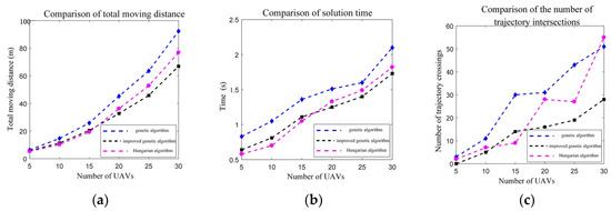 According to simulation comparison results in Figure 7, the improved genetic algorithm demonstrates the smallest total distance traveled. In terms of solving time, the Hungarian algorithm experiences slower solving speed due to the increasing matrix dimension with a growing number of UAVs, while the improved genetic algorithm becomes faster. Additionally, regarding the number of trajectory crossings, the improved genetic algorithm maintains fewer crossings compared to the ordinary genetic algorithm and the Hungarian algorithm, which do not consider this element and result in more random trajectory crossings. In conclusion, the proposed improved genetic algorithm exhibits excellent performance in solving the queue transformation goal assignment problem.