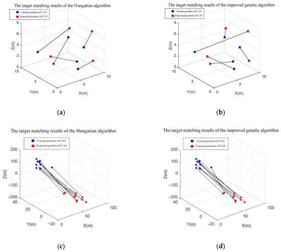 (a) Description of Hungarian algorithm target-matching results for 5 UAVs; (b) Description of improved genetic algorithm target-matching results for 5 UAVs; (c) Description of Hungarian algorithm target-matching results for 10 UAVs; (d) Description of improved genetic algorithm target-matching results for 10 UAVs.