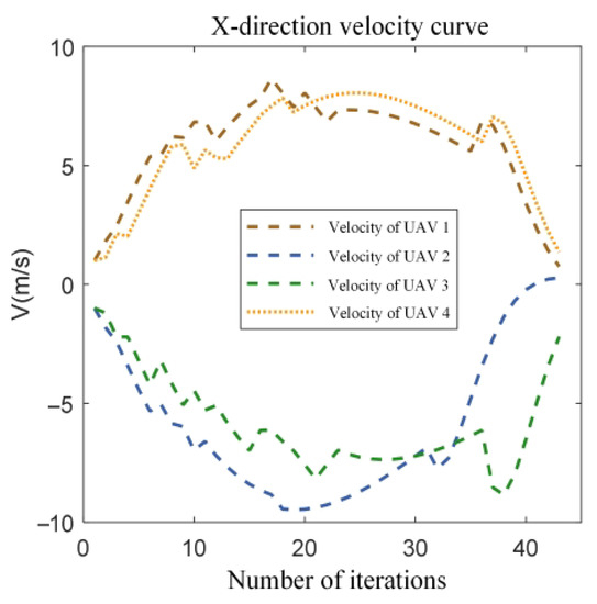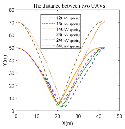 This subsection examines the impact of collision avoidance constraints in the trajectory-planning algorithm to demonstrate that collision-free arrival at the target position is possible during the formation transformation. We set the initial formation of four UAVs as a rectangle to necessitate trajectory crossover during the transformation process. The crossover transformation is then applied to the diagonal vertices within the 2D plane. The coordinates of UAVs 1–4 are set as (0, 0), (50, 50), (50, 0), and (0, 50), respectively, and the simulation results are presented in Figure 9, Figure 10, Figure 11 and Figure 12.