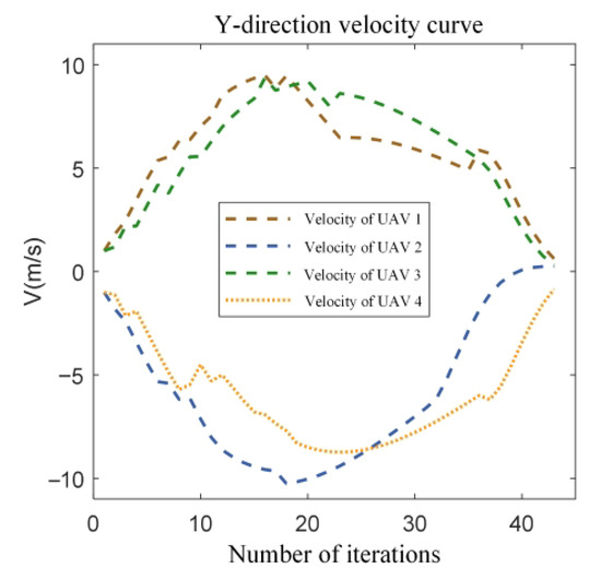 When the formation spacing was decreased, the single-axis distance between UAVs ranged between 2 m and 4 m. Simulation results indicate that collision-free trajectory planning can still be achieved with smooth convergence from the current formation “N” to the desired formation “A”, as shown in Figure 20, Figure 21 and Figure 22.