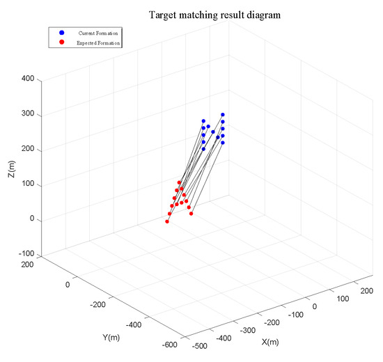 In the process of formation transformation, the total distance from the current formation to the desired formation is the metric that we need to optimize, and the smaller the distance sum, the better. Suppose there are n UAVs, the position of the UAV in the current formation is (xi, yi, zi), the corresponding matching target point in the desired formation is marked as (ai, bi, ci), and the total distance cost is dsum; then, we have the following equation: