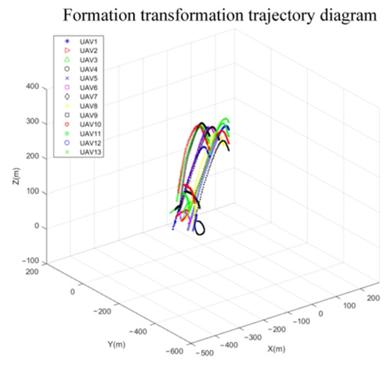 The goal of the simulation was to change the 13 UAVs from the initial “M” formation to the “A” formation, and the initial and final formations of UAV 1 to UAV 13 are shown in Figure 23.