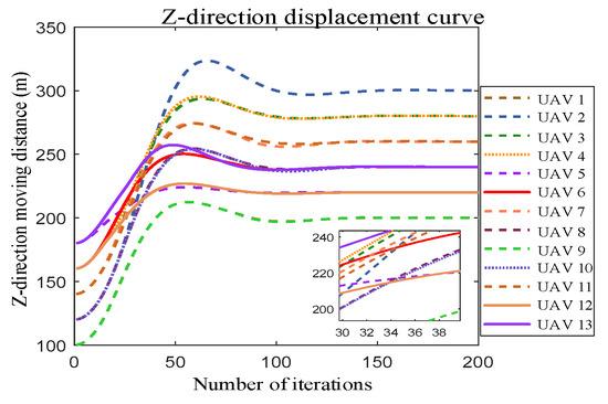 Sparse formation transformation z-directional displacement curve for 13 UAVs.