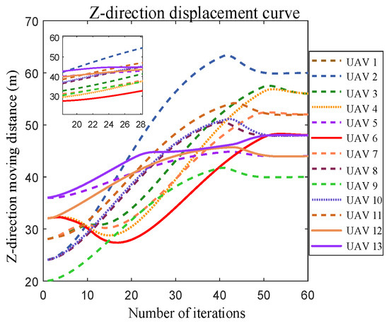 Compact formation transformation z-directional displacement curve for 13 UAVs.
