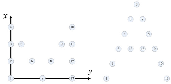 Selecting the appropriate encoding method for a genetic algorithm is crucial and should depend on the specific problem and solution. Binary and symbolic coding methods are appropriate for solving the target point matching problem. Binary coding offers simple coding and decoding operations, crossover, and easy implementation of mutation operations. Here, each point of the current and desired formations is labeled as 1, 2, 3, ⋯, n, and a feasible solution is represented by a two-dimensional matrix. The current queue number serves as the column number while the desired queue number acts as the row number. Each column has a separate match for each row, where the matrix element for the matching row position is 1, and the rest of the row elements in that column are 0. Ten UAVs are arranged in formation as shown in Figure 1.
