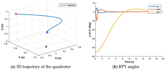 The path in Figure 10a is very smooth and the RPY signals are quite realizable. Again, signal in blue starts with saturation for a short time interval. In Figure 10c, it is also clear that the nonlinear time-varying design provides zero initial velocities, which are essential for realization. Furthermore, the system behaves like the classical system after the nonlinear term is disabled after 2 s in Equation (18).