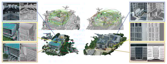Figure 13 presents a visual comparison of trajectory and surface details across different scenes for various methods. In comparison to other state-of-the-art methods [10,12,21], our approach excels at capturing images that make a significant contribution to reconstructions by employing continuous trajectories in close proximity to the building surface. This capability enables the reconstruction of finer surface details.
