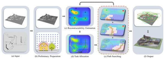 Due to the rapid advancements in UAV technology, small commercial UAVs equipped with a single high-resolution camera are becoming more affordable. Typically, the great success achieved in image-based reconstruction [1,2,3,4] has led to the widespread adoption of UAVs for the image captures and 3D reconstructions of large scenes. Commercial software, such as DJI-Pilot [5] and Pix4Dcapture [6], offers the capability to automatically generate grid flight paths for the complete coverage of the designated area. Nevertheless, these paths typically capture scene images uniformly at a fixed height and viewing angle, resulting in challenges when capturing the detailed elevation information of buildings. Consequently, certain studies [7,8,9,10,11,12,13] have employed a two-stage “explore-and-exploit” approach. Initially, during the “explore” phase, images are rapidly captured using an overhead grid path, leading to the reconstruction of a coarse scene model known as a proxy. Subsequently, during the “exploit” phase, the optimal path for reconstruction is generated under the guidance of the proxy. These works have demonstrated that high quality 3D models can be effectively reconstructed using the “explore-and-exploit” strategy.