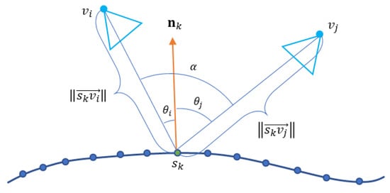 By establishing a heuristic relationship between the viewpoints and the reconstructability of the scene, the reconstruction effect of the scene can be quickly predicted [10]. As shown in Figure 3, the reconstructability contribution of the viewpoint pair to the surface point is defined as follows: