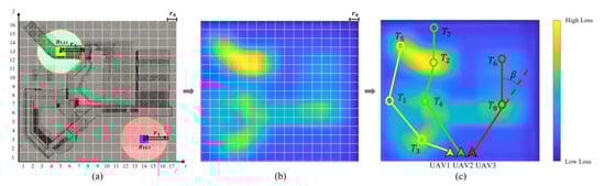 In the task localization method, we begin by sorting the reconstructability loss values of all grid cells in the RLM. Then, we select cells with the highest loss values among them, ensuring that the distance between each selected cell exceeds the maximum visible distance, . The locations of these cells are designated as the task targets for the multi-UAV system, as depicted in Figure 4c.