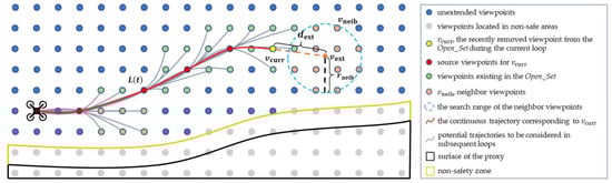 We have developed a novel A* algorithm to extend the path of UAV towards the region where the task target is located. The schematic diagram and pseudo-code of the algorithm are presented in Figure 5 and Algorithm 1, respectively. The algorithm follows a similar framework to the traditional A*, and the process is outlined as follows: We begin by defining two sets of viewpoints, Open_Set and Closed_Set. Additionally, we assign a Score attribute to each candidate viewpoint in . Following initialization, the viewpoint with the lowest Score in Open_Set is successively moved to Closed_Set until it approaches the task goal . If is not yet close to , we search for neighboring viewpoints in the candidate viewpoints that are not in Closed_Set and are in a safe space. The viewpoints in that are not part of Open_Set are added to Open_Set, and we calculate the score for each neighboring viewpoint . If is lower than the original Score of , we update the Score of to and its source viewpoint to .