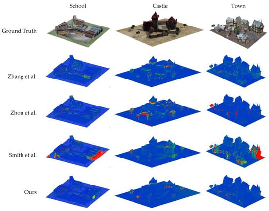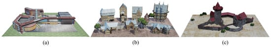 To conduct a comprehensive evaluation and comparison with advanced methods, we utilized the UrbanCity dataset, published by Lin et al. [14]. This dataset encompasses diverse synthetic scenes and includes trajectory and image data generated through a variety of state-of-the-art technologies [10,12,21], along with an oblique photography method for each scene. This facilitates convenient comparison experiments for our study. Three representative scenes with distinct characteristics (School, Town, and Castle) were chosen from UrbanCity, as depicted in Figure 6. These three scenes encompass the majority of prevalent artificial building types.