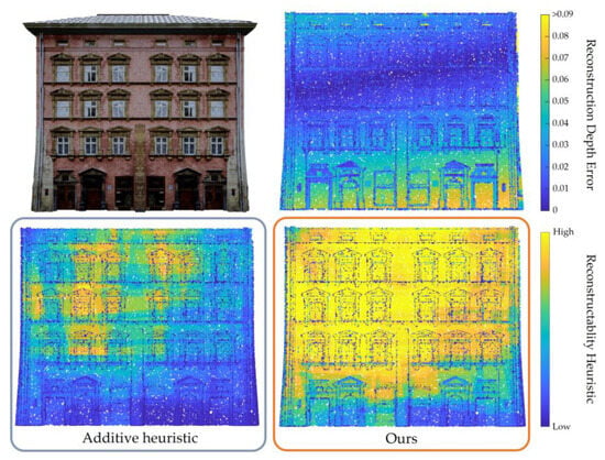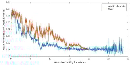 Here, we set the parameters , , , and as suggested by Smith et al. [10]. The parameter represents the maximum observable distance of a viewpoint, and typically, a smaller value of leads to improved reconstruction accuracy. Smith et al. [10] proposed an additive heuristic to quantify the collective reconstructability contribution of the viewpoint set to the surface point :