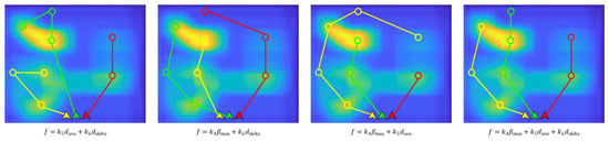 As described in Section 3.3.2, the objective function is utilized in each path searching loop to calculate the score of , which represents a neighboring viewpoint of . This score guides the selection of viewpoints and the extension of paths. The objective function is designed to achieve the following effects on path guidance: