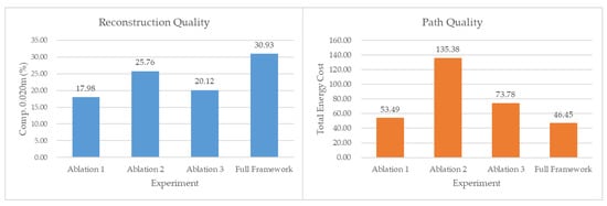 Comparison between various experiments regarding reconstruction quality (left) and path quality (right). We adopt Comp. 0.020 m as the metric for evaluating the reconstruction quality and Total Energy Cost for evaluating the path quality.
