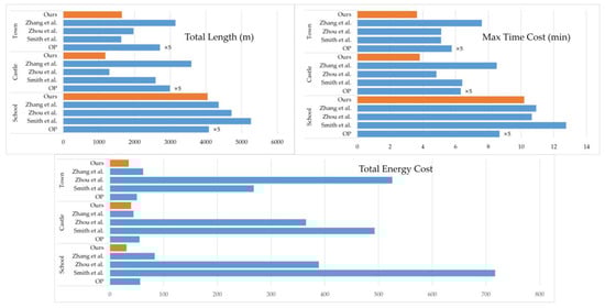 Comparison of trajectory quality among different methods in terms of Total Length, Max Time Cost, and Total Energy Cost. Due to the excessive total length and maximum time cost of oblique photography, only 1/5 of their values are presented in the figure to allow for clear comparison with other methods [10,12,21].