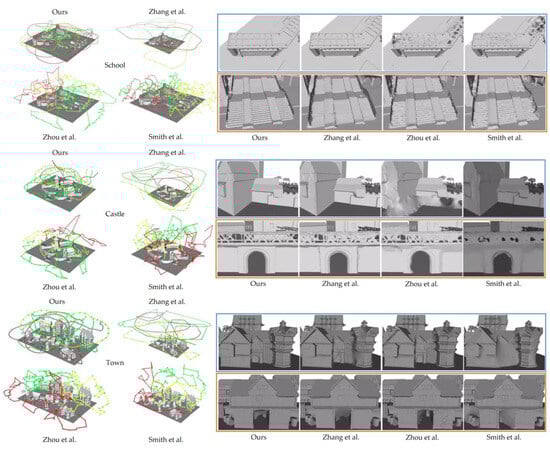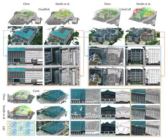 Figure 14 presents the visual effects of various methods in the GradSch, LiterColl, and Gym scenes, focusing on trajectories and the reconstruction of surface details. Due to space limitations, the performance of the oblique photography method is only displayed in the Gym scene at the bottom of Figure 14. In the Gym scene, the oblique photography method struggles to accurately recover the façade details of the building, resulting in stretched textures. Furthermore, the presence of duplicated textures on the roof of Gym presents a reconstruction challenge, resulting in surface holes in the reconstructed output of the method proposed by Smith et al. [10]. Our method effectively resolves this issue. Additionally, in the other two scenes, our method produces 3D models with enhanced surface details and a closer resemblance to the original geometry. This demonstrates that our method maintains an excellent 3D reconstruction performance in real scenes.