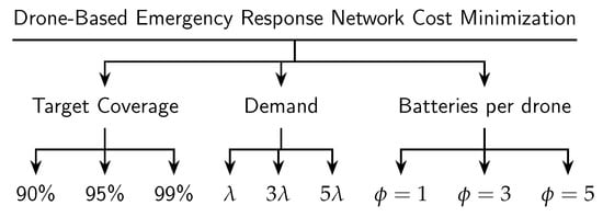 - To understand the impact of the battery capacity per drone, it is assumed that the demand is equal to the average observed () and three target coverage objectives are considered, with different limits on the number of batteries allowed per drone. Considering the additional batteries explicitly is important because drones can take about 60–90 min to recharge, so simply assuming that a drone is ready to fly when called is not sufficient, given the downtime associated with recharging the batteries.