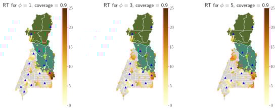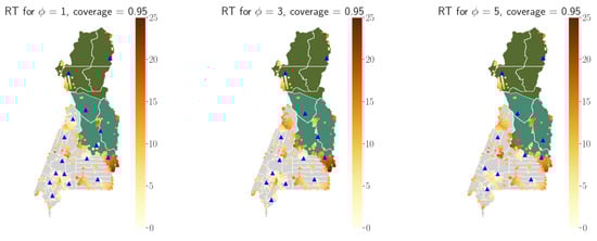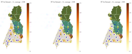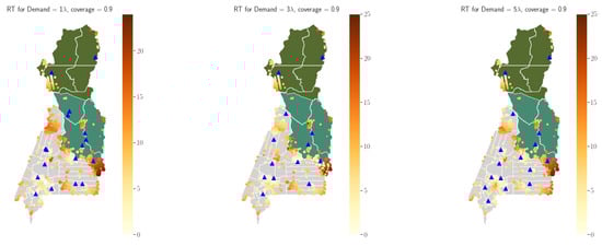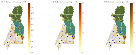- Assuming that the number of incidents in each census block group follows a Poisson distribution with rate , the impact of varying the incidence rate is studied. In the base case (demand scenario 1), it is assumed that for each census block group the average incidence rate is equal to the observed values for the 2020 and 2021 dry seasons. Additional incidence rates of 3 (demand scenario 3) and (demand scenario 5) are considered for each census block group. The network configuration is then estimated when under the three target coverage objectives.