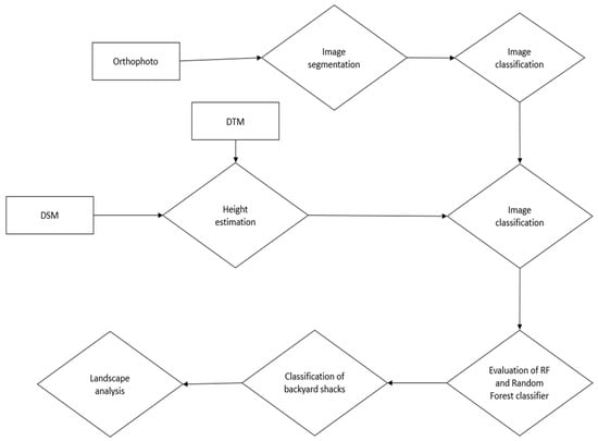 The first step in OBIA classification is the segmentation of an image into image objects that represent the objects of interest. The multiresolution segmentation algorithm created image objects representing land use features in the study area. Multiresolution segmentation is a bottom-up, region-merging technique that segments an image into image objects of homogeneous regions at any given resolution [40]. In the eCognition environment, the size of image objects resulting from the multiresolution segmentation algorithm is determined by scale parameters, shape, and compactness values. The ortho photo’s spectral bands, i.e., R, G, and B, were used with equal weight during segmentation. We used a supervised segmentation process to determine the parameters that best separate informal and formal dwelling structures. A supervised segmentation approach is a trial-and-error approach that allows the user to test the segmentation parameters and compare the results with expected objects via visual image recognition [16]. Scale parameter, shape, and compactness values of 60, 0.3, and 0.5, respectively, were used during segmentation. To improve the quality of the image objects, the spectral difference segmentation technique was applied to multiresolution segmentation results to allow for the merging of spectrally similar image objects, resulting in larger image objects representing the objects of interest. The spectral difference threshold of 4 was selected using the supervised segmentation method used during the multiresolution segmentation. We tested and evaluated the effectiveness of the Random Forest (RF) Classifier and rule-based classification technique that uses height information and OBIA to detect formal and informal building structures.