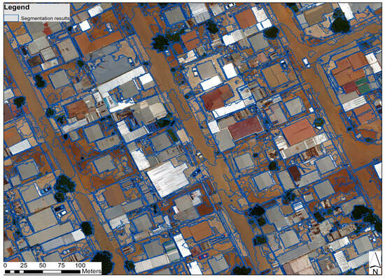 The multiresolution segmentation with scale, shape, and compactness values of 60, 0.3, and 0.5, respectively, created images representing formal and informal building structures and other land use features. Most of the building structures in informal were over-segmented. The formal building structures were also over-segmented but with bigger segments than the informal settlement structures. Some of the backrooms were also over-segmented. The spectral difference segmentation technique reduced the over-segmentation of some of the building structures (Figure 5). Most informal settlement building structures continued to experience over-segmentation even after applying the spectral difference segmentation algorithm. This may be attributed to the heterogeneity of the roofing material of informal building structures. Some of the roofs in informal settlements contained old, corrugated iron sheets, resulting in different grayscale levels on one roof (Figure 5). The same results were observed in some parts of the backrooms in the formal area. After applying spectral difference segmentation, most formal structures were covered by one or two image objects.