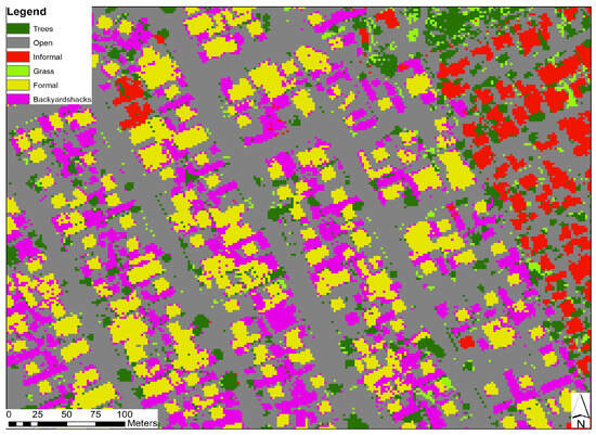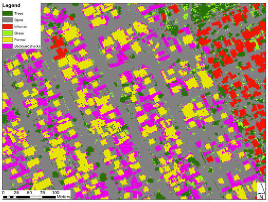 The rule-based classification technique was able to separate backyard shacks, formal and informal dwelling structures, grass, and tree classes with high accuracy compared with the RF classifier (Figure 7). Most of the edges of the formal structures were misclassified as backyard shacks compared with results achieved using the RF classifier. There were a few cases where building structures were misclassified as trees. Most informal settlement dwelling structures were correctly classified. Some of the backyard shacks were misclassified as free-standing informal settlement dwelling structures. This may be attributed to the use of proximity analysis to classify backyard shacks as free-standing informal dwelling structures, as some of the building structures in informal settlements are almost the same height as formal structures.