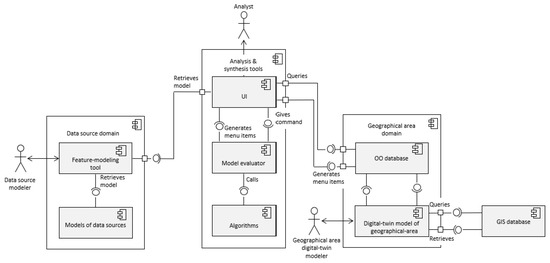 A symbolic representation of the architecture is given in Figure 2, using the ‘UML component diagram’ notation. Three stakeholders are shown in the figure: Analyst, Data source modeler, and Geographical area digital-twin modeler in ‘actor’ notation. The stakeholder Designer of the system, who is in charge of designing and implementing the framework, is not shown here. With the help of the component UI, the Analyst analyzes or synthesize the prospective sensor fusion alternatives. To this aim, Data source modeler defines the models of the available data sources using the feature-modeling tool, as explained in the previous section. Geographical area digital-twin modeler is responsible for creating a model of the geographical area that is considered. The UI component retrieves data from the components Feature-modeling tool and OO database. The component OO database, in turn, accesses the component Digital-twin model of Geographical-area. An external GIS database provides the necessary data for this purpose. The component UI utilizes the functions offered by the component Model evaluator for the analysis and synthesis operations. The component Algorithms offers the necessary algorithms for both analysis and synthesis. For dynamic menu generation, the components Simulator and OO database use the services of the component UI.