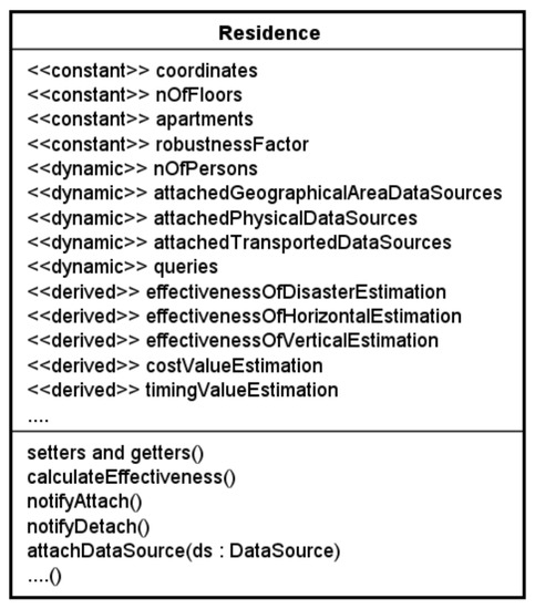 The dynamic attributes whose names begin with the word attached, are responsible for storing the data sources that are attached to the corresponding instance of class Residence. As we are dealing with a modeling environment, the values of these attributes are objects that represent the data sources. They are also used for calculating the effectiveness, timing, and cost factors of the corresponding instance.