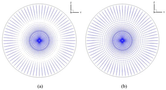 Figure 2 presents the velocity vector diagram, illustrating the conditions both upstream and downstream of the actuator disk. Figure 2 is the velocity vector diagram before and after the actuator disk. The flow in front of the disk is found to have no circumferential velocity. In contrast, the downstream flow manifests a discernible circumferential velocity, indicating the presence of a swirl flow. This pattern aligns with the actual aerodynamic behavior, verifying the model’s validity.