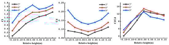 Figure 5 illustrates the interrelationships between the lift coefficient, drag coefficient, and lift/drag ratio of a UAV wing at angles of attack of 3°, 6°, and 9°, in relation to the relative height of the propellers. It is observed that the lift coefficient of the wing positively correlates with the increasing relative height of the propellers. Furthermore, as the propeller moves farther from the wing, an approximate increase in the drag coefficient is noticed, with the drag coefficient reaching its lowest value when the relative height of the propellers from the wing is zero. As a result, the lift/drag ratio diminishes as the propeller descends below the wing and reaches its maximum when the relative height of the propeller from the wing is zero.
