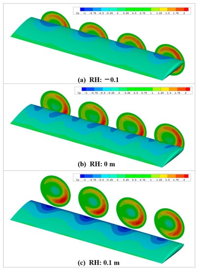 These observations are further validated by Figure 6, which portrays the distribution of the upper surface pressure coefficient of the wing. In the legend, “RH” is an abbreviation for the relative height of the propeller. When the propeller is positioned at a relative height of −0.1 m, fewer low-pressure areas are observed on the upper surface of the wing. However, as the relative height of the propellers increases, more low-pressure areas become evident on the wing’s upper surface, indicating an increase in lift obtained by the wing.