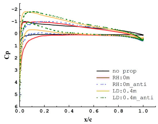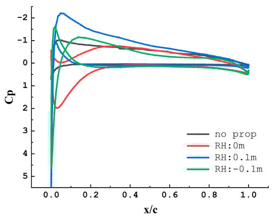 Further, we can analyze the sectional pressure coefficient along the wing chordwise. At an angle of attack of 6°, the chordal surface at 1.25 m (which corresponds to the center of the third propeller disk) in the y-direction of the wing is selected to extract the pressure coefficient data. This data is depicted in Figure 7. As the figure shows, when the relative height is −0.1 m (indicating the propeller is positioned under the wing), the pressure coefficient on the lower surface of the leading edge of the wing is smaller than the pressure coefficient on the top surface. As a whole, the pressure difference between the upper and lower surfaces of the wing is the smallest. When the relative height is positive, the pressure difference between the upper and lower surfaces of the wing is larger, and the wing can obtain greater lift. When designing a distributed propeller layout, the propeller can be properly mounted at a certain height above the wing.