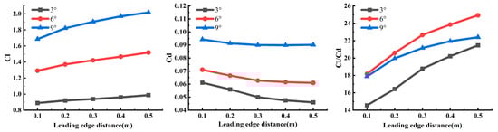 Curves of the lift coefficient, drag coefficient, lift/drag ratio, and leading-edge distance at different angles of attack.