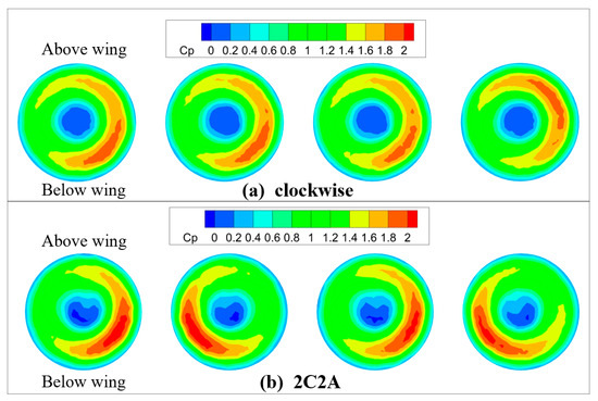 In order to compare the effect of rotation direction, two cases are designed, as shown in Figure 10. One case is that the four propellers are rotating clockwise (viewed along the negative X-axis). The other case is that the first and third propellers remain unchanged clockwise rotation, and the second and fourth propellers become counterclockwise rotation (2C2A). The impact of the rotating direction on the wing performance is shown in Table 5. The wing lift and drag of the counter-rotating are less than those of the co-rotating for all cases.