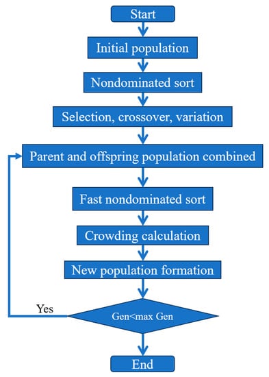 The nondominated sorting genetic algorithm (NSGA) is a multi-objective algorithm based on a genetic algorithm. The primary distinction between the NSGA and the fundamental genetic algorithm lies in NSGA’s approach of executing rapid nondominated ranking on individuals prior to the selection operation. This strategy enhances the likelihood of retaining high-performing individuals. Other operations such as selection, crossover, and mutation are identical to those employed in the standard genetic algorithm. Extensive research and testing by numerous scholars have demonstrated that the NSGA surpasses traditional multi-objective genetic algorithms in performance. However, the NSGA is found to still have some shortcomings in practical applications, and the NSGA-II [30,31,32] has made some improvements to make up for the defects of the NSGA. NSGA-II has three new innovations—a fast nondominated sorting procedure, a fast crowded distance estimation procedure, and a simple crowded comparison operator [32]. NSGA-II has the properties of a fast nondominated sorting procedure, an elitist strategy, a parameter-free approach, and a simple yet efficient constraint-handling method. The NSGA-II procedure is shown in Figure 12.