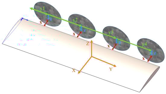 The direction of incoming flow aligns with the X-axis, which corresponds to the wing’s chord direction. The Y-axis is the spanwise direction, and the Z-axis is perpendicular to the plane where the chord and spanwise direction of the wing are located, satisfying the right-hand rule. The simulation test conditions are as follows: the incoming flow speed is 20 m/s; the rotation rate of the four propellers is 2800 r/min; and the steering is clockwise rotation (viewed along the negative X-axis).